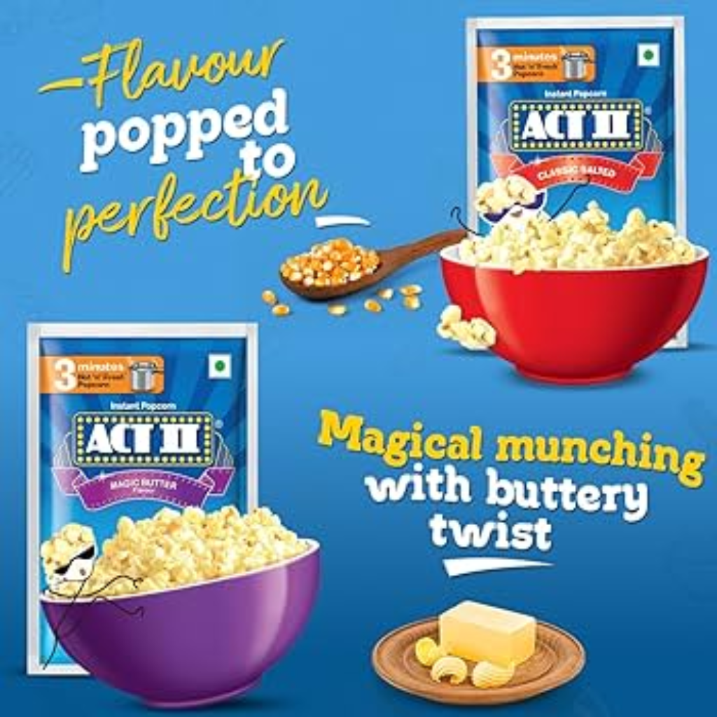 Act II brings to you Instant Magic Butter Popcorn corn kernels that help you make delicious popcorn within minutes. Now enjoy delicious hot popcorn at home. It contains the flavour of butter and the wholesome goodness of 100% wholegrain popcorn. It is filled with fibre that helps you to not feel hungry. Serve it at your parties and everyone will love and enjoy it.