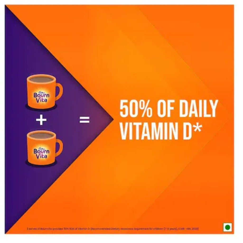- 50% of Daily Vitamin Do o2 serves of Bournvita provides 50% RDA of Vitamin D (Recommended Dietary Allowance requirement for children (7-9 years), ICMR -NIN, 2020)