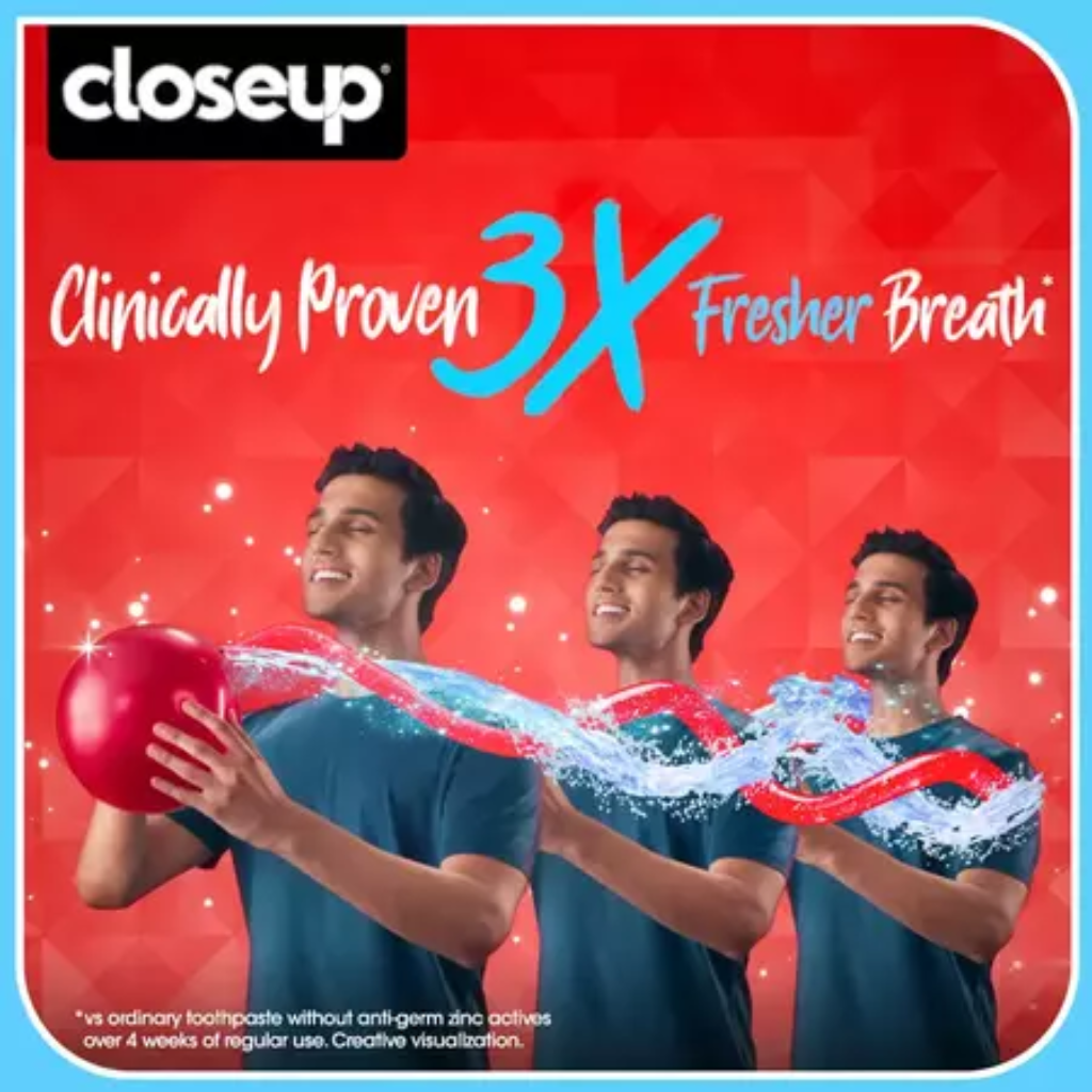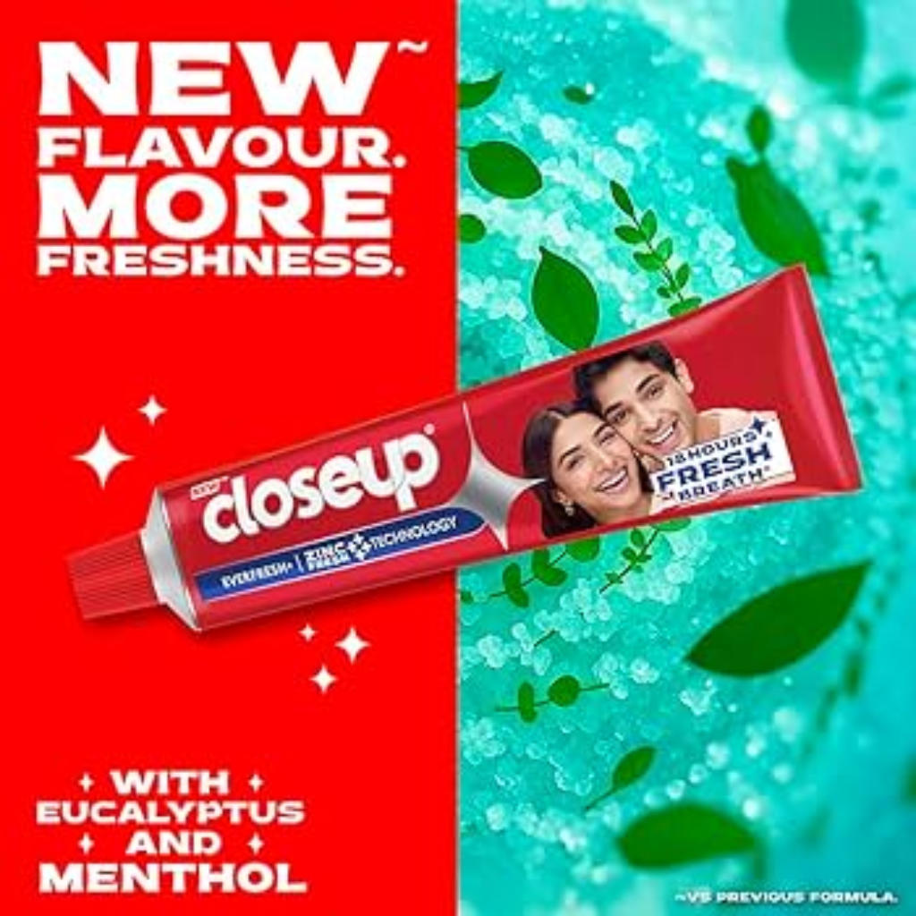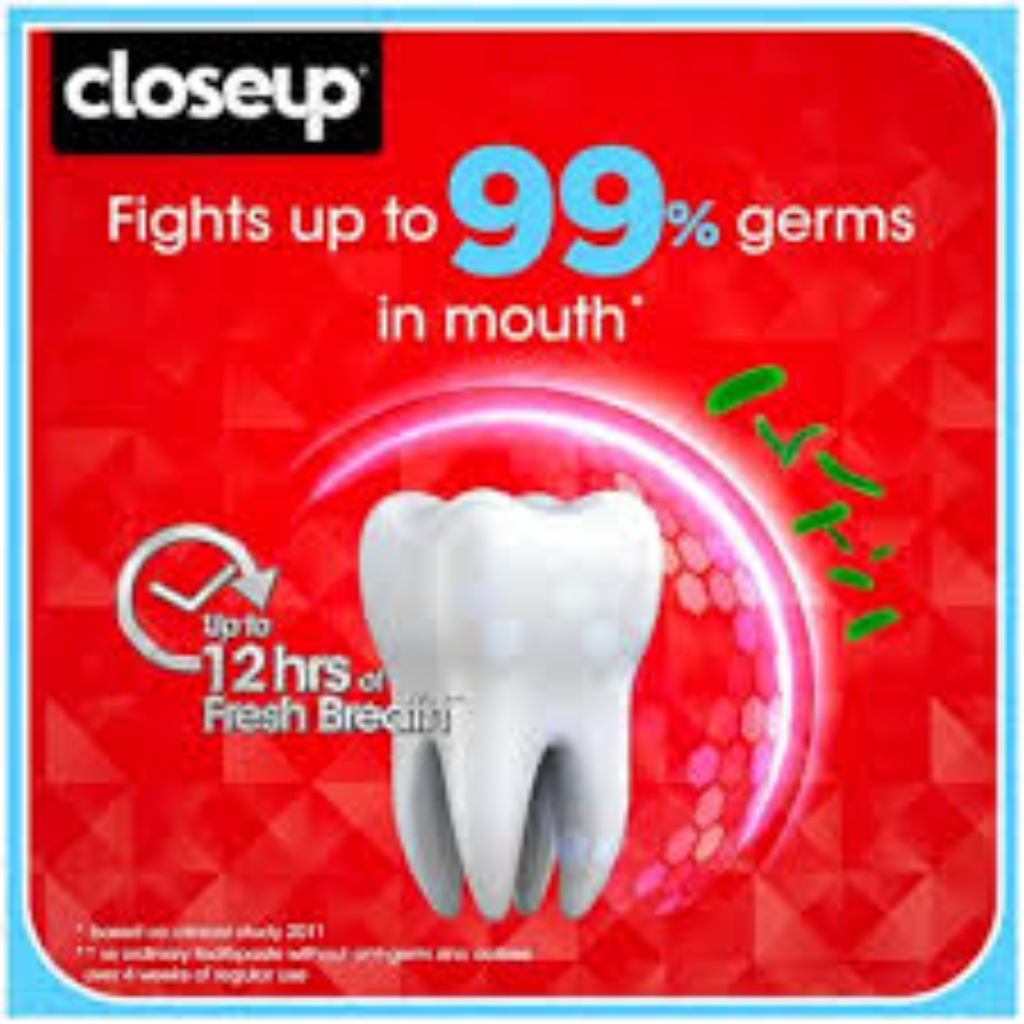 • Closeup Red Gel Toothpaste with Zinc Fresh Technology fights against 99% germs to give you 18 hrs of long-lasting fresh breath.