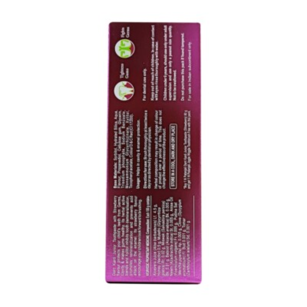 Dant Kanti Junior Toothpaste with Strawberry flavour protects your child’s teeth from Germs, Cavity & makes gums healthy. Its herbal active blends and Xylitol inhibits tooth demineralisation, promotes remineralisation, and prevents acid attack on the enamel.