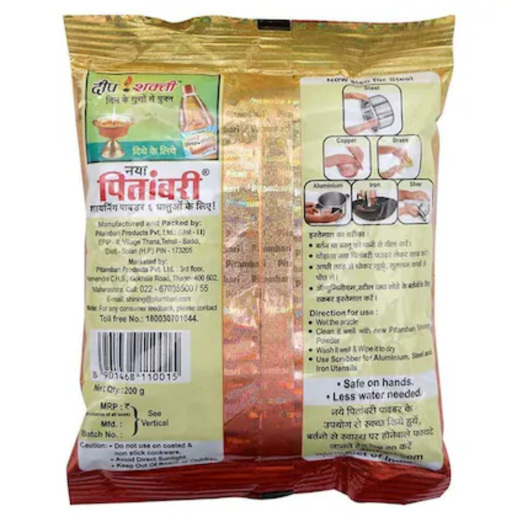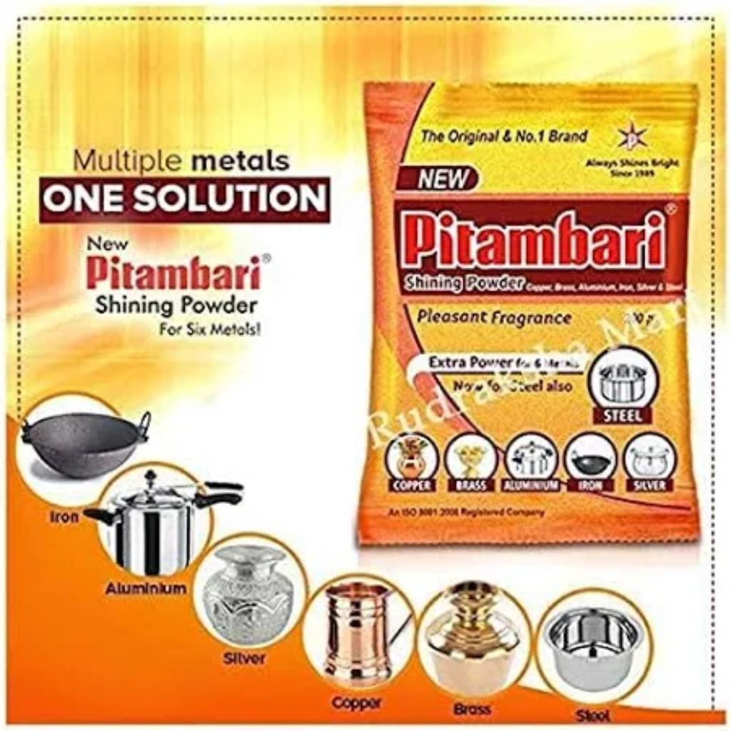 New Pitambari Shining Powder is introduced with special cleaning agent in it that removes oiliness & the other stains easily gives with giving shine & gloss to metal surfaces Also, it is gentle on hands. Its diamond edge cutting property gives fast cleaning effect. Cleans, protects, preserves and restores the shine and luster to a variety of different surfaces.